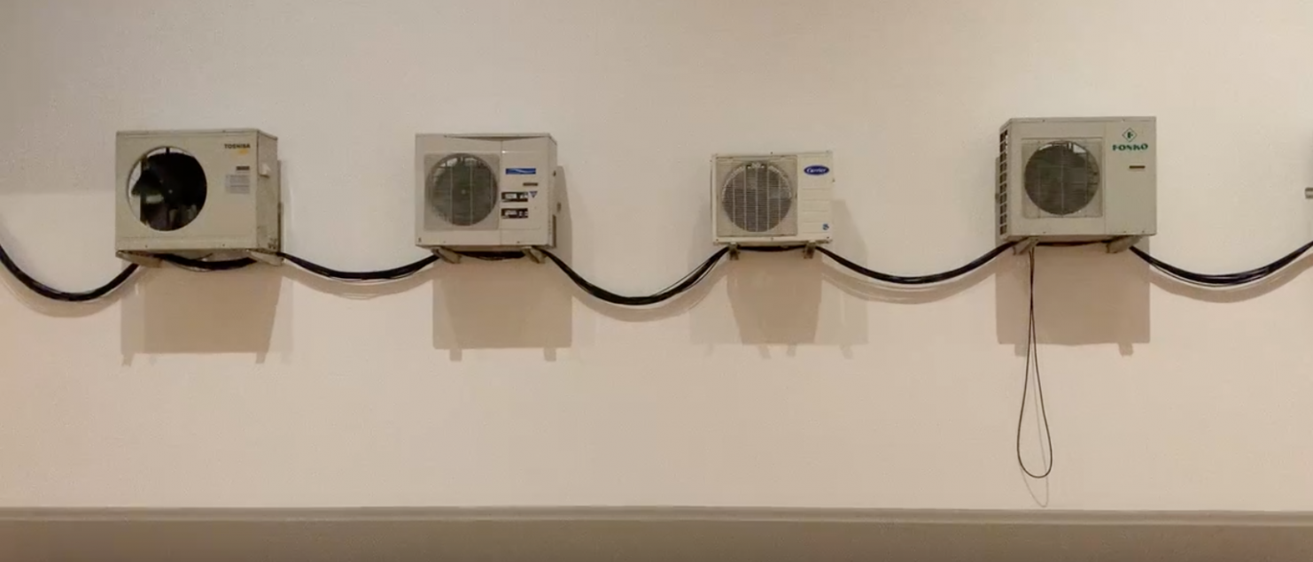 Eleven industrial air conditioners are placed along the walls of the gallery. Directed towards the space above the inserted ceiling, they follow a composed score from a slowed down audio track. The units switch to different rhythms and speeds, filling the gallery with sound.